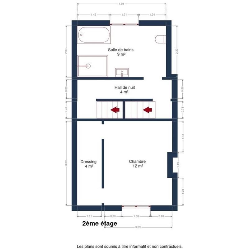 A l'étage : Un hall de nuit desservant une chambre et une salle de bain à parachever avec baignoire et douche.