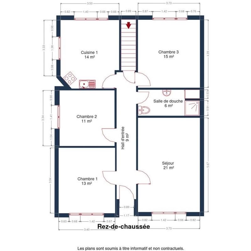 AU rez-de-chaussée : Un hall d’entrée, un lumineux séjour de ± 21 m², une cuisine, trois chambres et une salle de douche.