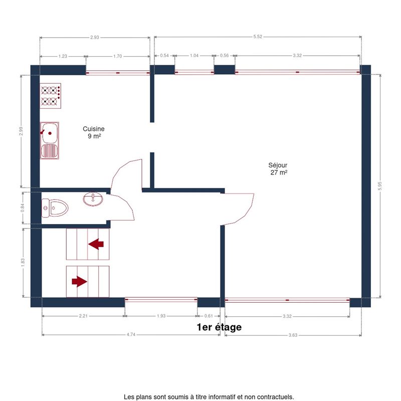Au 1er étage : hall d’entrée, lumineux séjour, cuisine semi-équipée et WC indépendant.