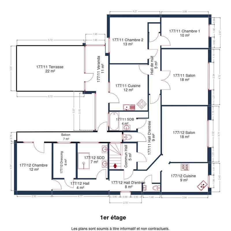 Au RDC : Un hall d’entrée privatif donnant accès à un premier appartement, lui-même composé d’un séjour, d’une chambre, d’un dressing, d’une salle de douche et d’une cuisine. Cet appartement dispose également d’un garage ainsi que d’une cour commune accessible directement depuis celui-ci.
