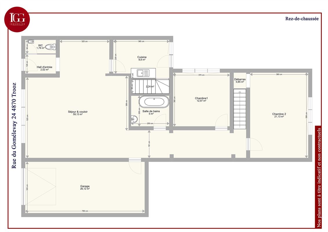 Elle se compose au rez : d'un hall d'entrée, un wc indépendant, un beau et grand séjour de 59m², un espace cuisine, une salle de bain, deux chambres de 13 et 21m², un garage et à l'étage