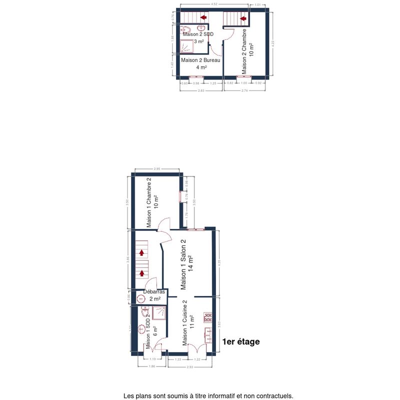 ·1er étage : hall de nuit, séjour, cuisine, chambre et salle de douche,