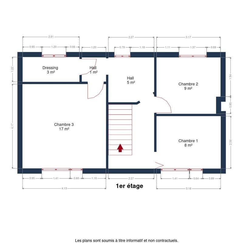 Au premier étage, le hall de nuit dessert trois chambres de ± 8 m², 9 m² et 17 m², ainsi qu'un espace anciennement utilisé comme dressing.
