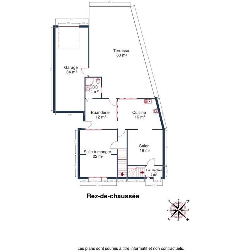Elle se compose, au rez-de-chaussée, d'un hall d'entrée, d'un séjour donnant accès à une cuisine meublée, d'une salle à manger, d'une buanderie ainsi que d'une salle de douche avec WC.