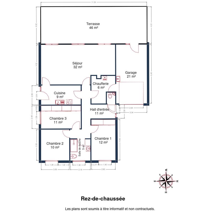 Il se compose d'un hall d'entrée desservant un grand séjour de 32m², une cuisine équipée, un WC indépendant, un espace chaufferie, une salle de douche et un garage.