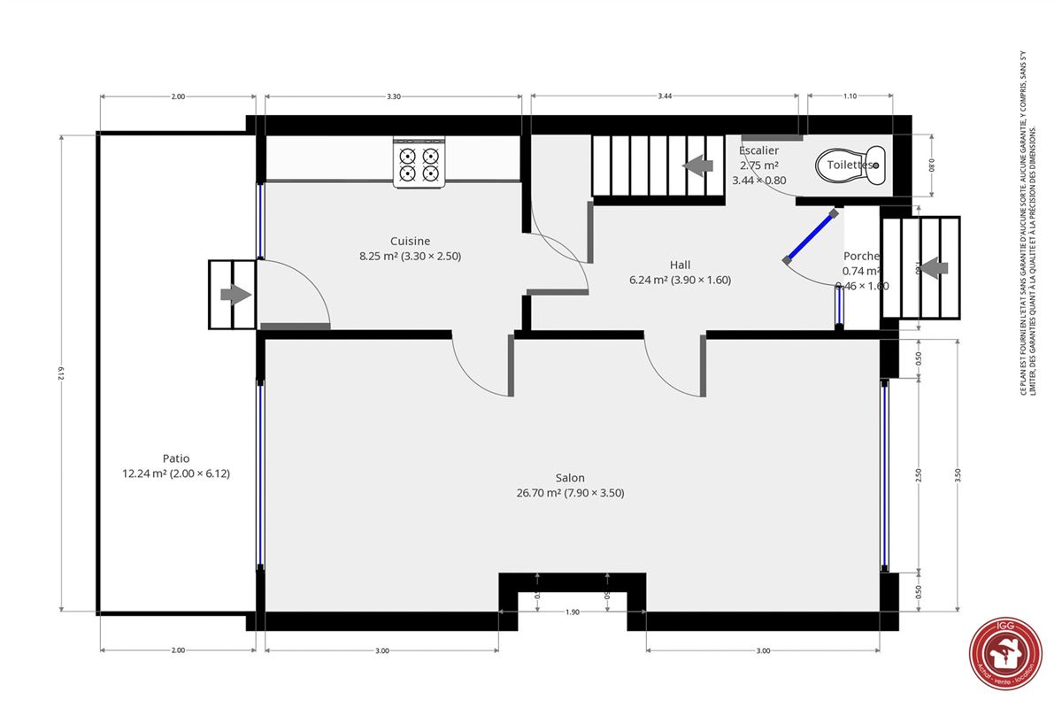 Au rdc: un hall d''entrée,un salon, une salle à manger, une cuisine semi-équipée donnant accès à un patio et au jardin.